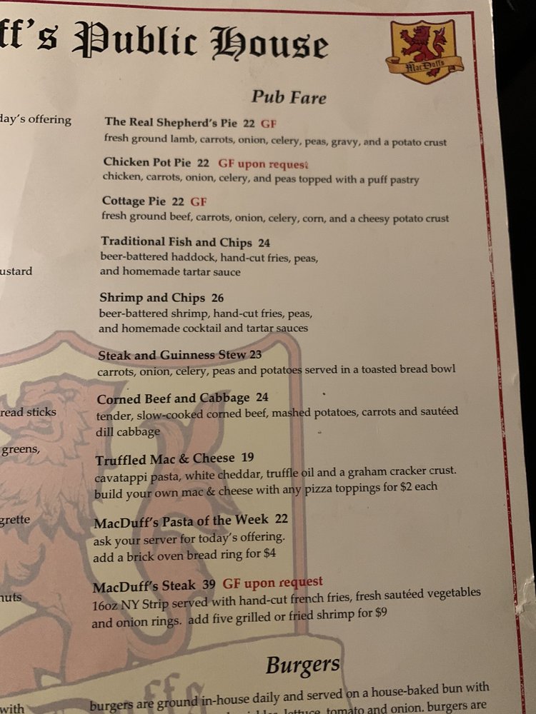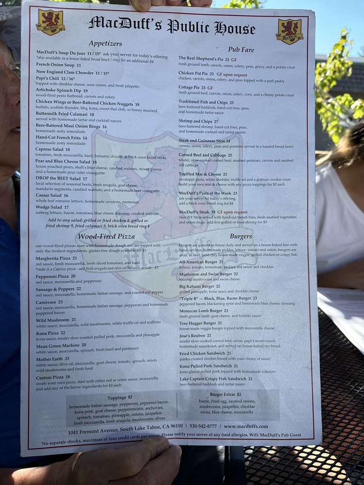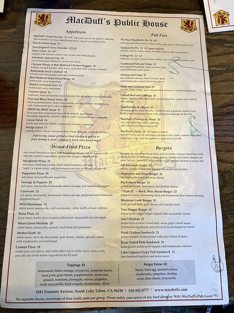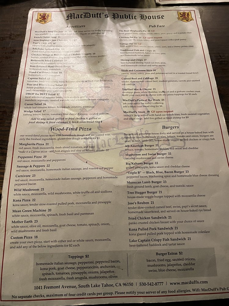 MacDuff's Pub, a Scottish-themed restaurant located in South Lake Tahoe, offers a wide variety of menu options, ranging from appetizers like French Onion Soup to hearty pub fare like The Real Shepherd's Pie. With a casual atmosphere and a full bar, MacDuff's Pub is a great spot for dinner, especially on weekends. Customer reviews highlight the generous portion sizes and the quality of dishes like the Guinness beef stew and the chicken pot pie. The friendly staff and dog-friendly policy add to the welcoming ambiance of the pub. Overall, MacDuff's Pub is praised for its delicious food, large portions, and authentic pub atmosphere. Be sure to try the bread pudding and shepherd's pie for a truly satisfying dining experience.