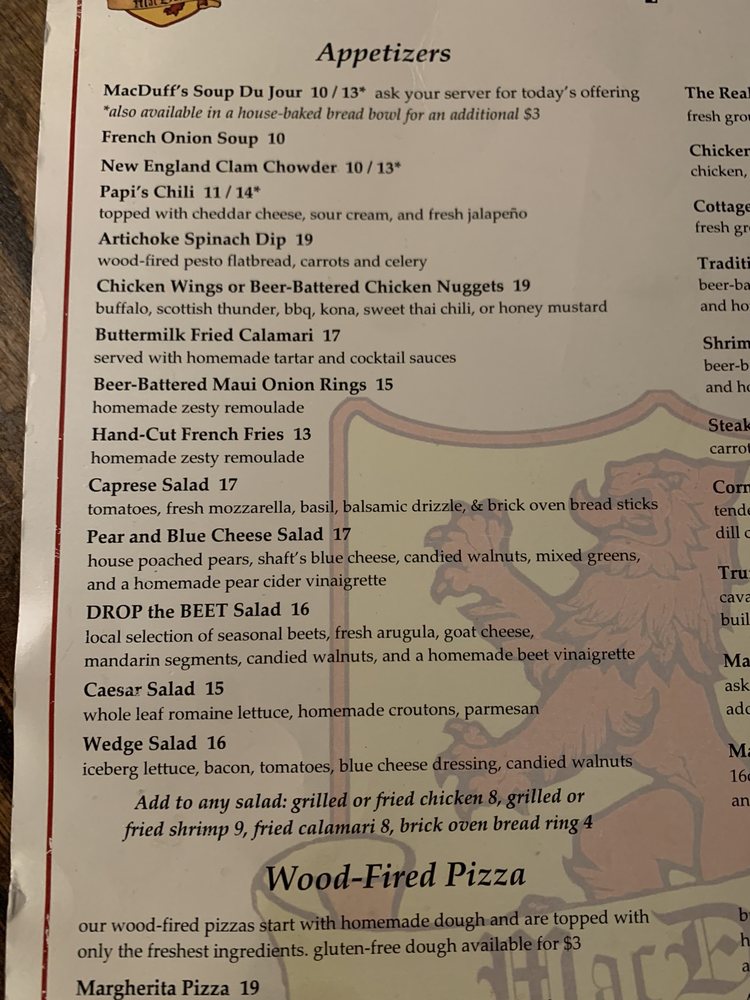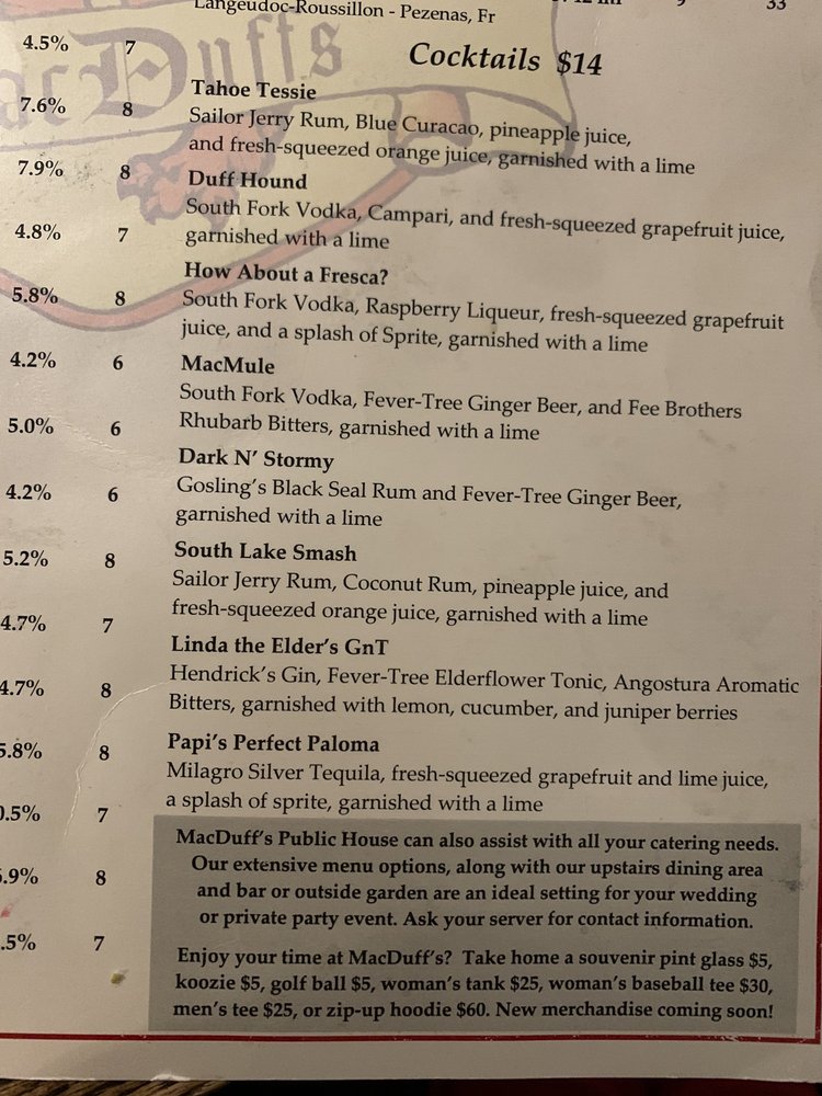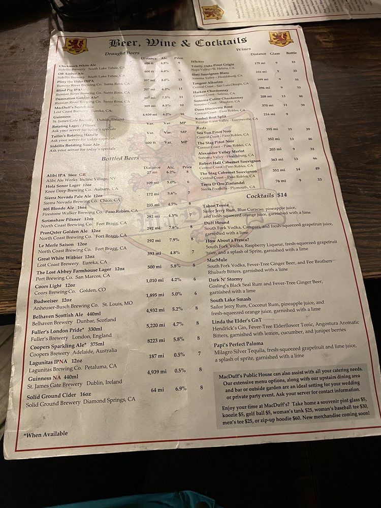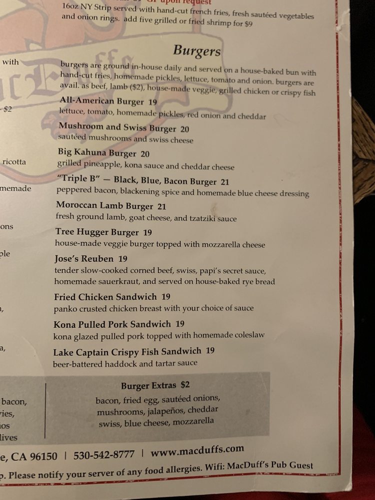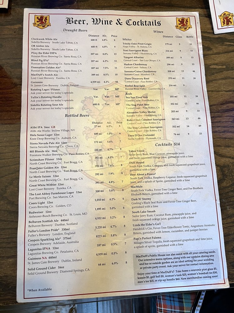 MacDuff's Pub, a Scottish-themed restaurant located in South Lake Tahoe, offers a wide variety of menu options, ranging from appetizers like French Onion Soup to hearty pub fare like The Real Shepherd's Pie. With a casual atmosphere and a full bar, MacDuff's Pub is a great spot for dinner, especially on weekends. Customer reviews highlight the generous portion sizes and the quality of dishes like the Guinness beef stew and the chicken pot pie. The friendly staff and dog-friendly policy add to the welcoming ambiance of the pub. Overall, MacDuff's Pub is praised for its delicious food, large portions, and authentic pub atmosphere. Be sure to try the bread pudding and shepherd's pie for a truly satisfying dining experience.